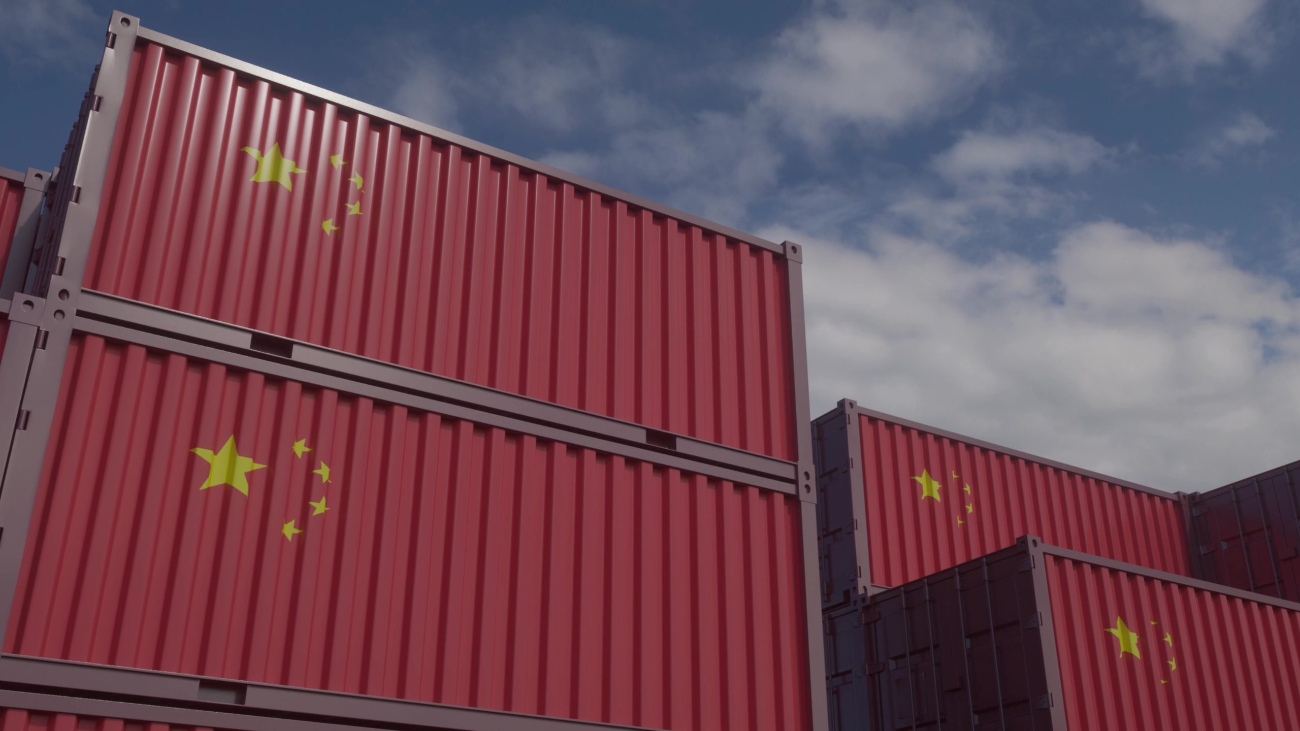 China flag containers are located at the container terminal. Concept for Chinese import and export business. 3d illustration